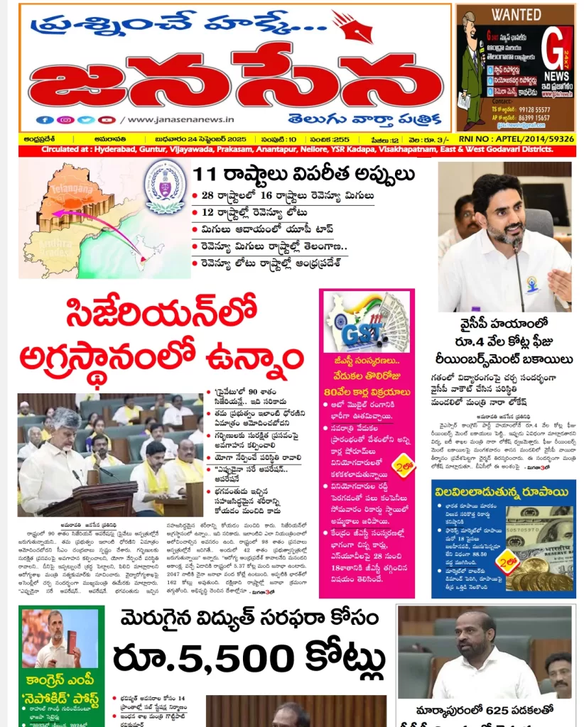 Stay updated with Andhra Pradesh’s latest headlines from Janasena News Paper, September 24, 2025. Access breaking crime news, politics updates, and cricket highlights in Telugu. Get comprehensive coverage of local news and trending stories tailored for readers seeking timely, reliable updates from AP.