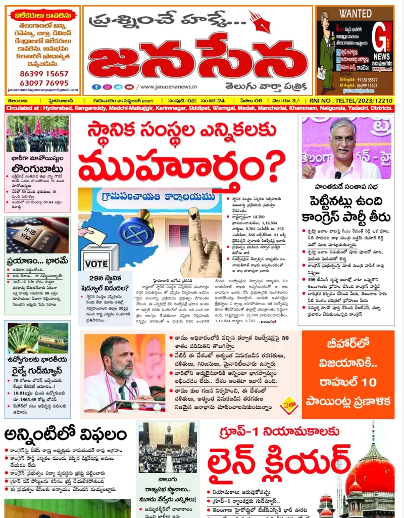 జనసేన న్యూస్ పేపర్ – తాజా తెలంగాణ, ఆంధ్రప్రదేశ్, జాతీయ, అంతర్జాతీయ వార్తలు, రాజకీయాలు, వ్యాపారం, క్రీడలు, వినోదం, ఎడిటోరియల్స్ ఒకే వేదికలో.